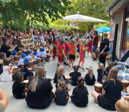 Die Projektwoche endete mit einer Aufführung im Rahmen des Kita-Sommerfestes. In liebevoll von den Erzieherinnen gebastelten Kostümen präsentierten die Kinder stolz ihren Familien, was sie gelernt hatten. Die strahlenden Gesichter der Kinder und die begeisterte Reaktion der Zuschauer unterstrichen den Erfolg dieses Projekts. Die Trommelreise wird den Kindern sicher noch lange in guter Erinnerung bleiben.